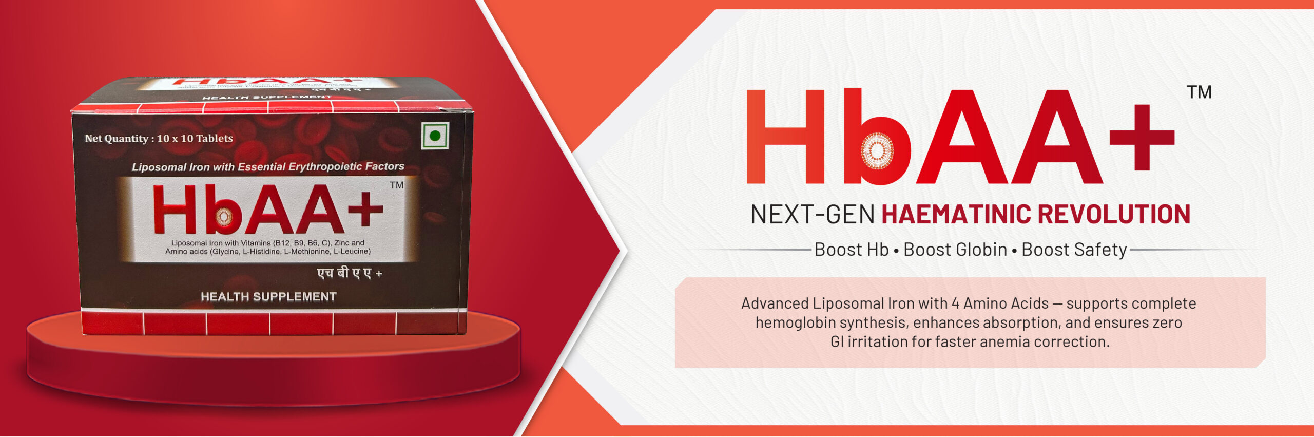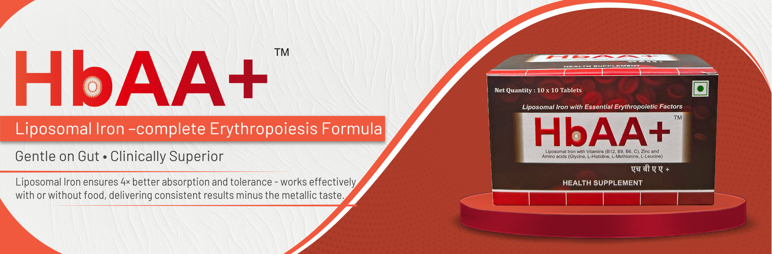 HBAA+ is an advanced haematinic designed to address both Haem and Globin synthesis — a dual challenge often unmet by conventional iron supplements. It combines Liposomal Iron (Ferric di-phosphate) with key amino acids (Glycine, Histidine, Leucine, Methionine) and essential vitamins (Folic acid, B12, B6, C, and Zinc) to ensure efficient erythropoiesis, better absorption, high bioavailability, and excellent gastrointestinal tolerance.