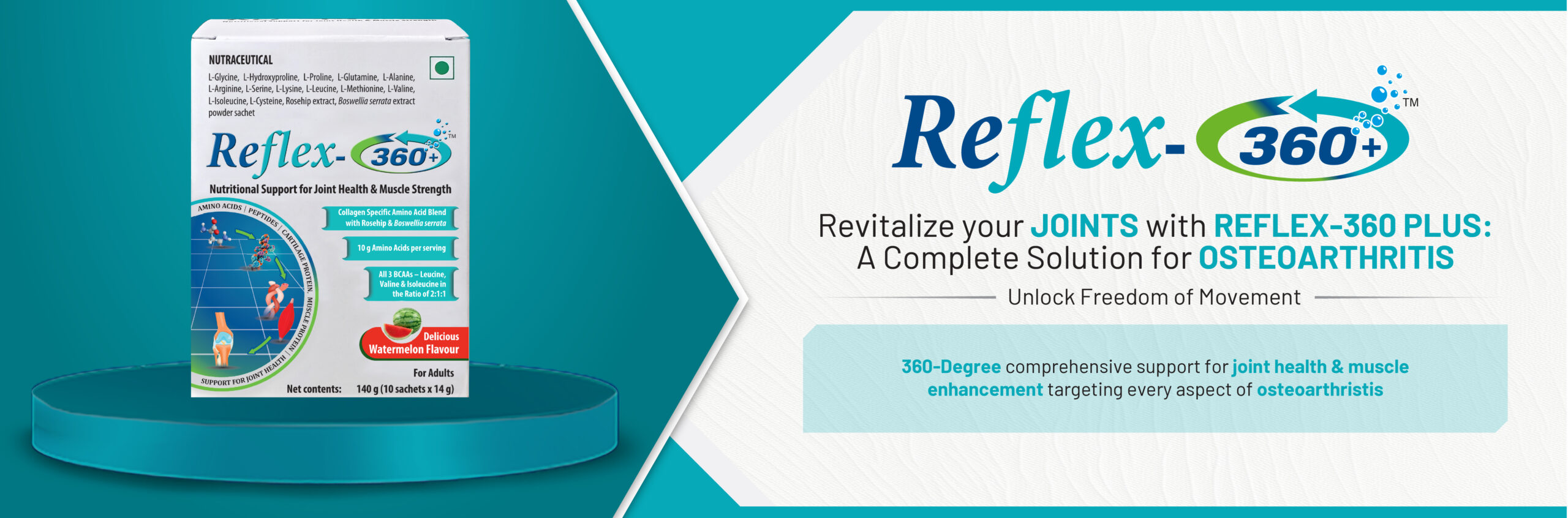 By combining 13 collagen-specific amino acids, BCAAs, Rosehip extract, and Boswellia serrata extract (Boswellin® Water-Soluble), Reflex-360+ addresses the key pathological mechanisms of osteoarthritis—cartilage degeneration, muscle weakness, inflammation, and pain. This integrated approach not only provides symptomatic relief but also supports long-term joint health, improved mobility, and enhanced quality of life.